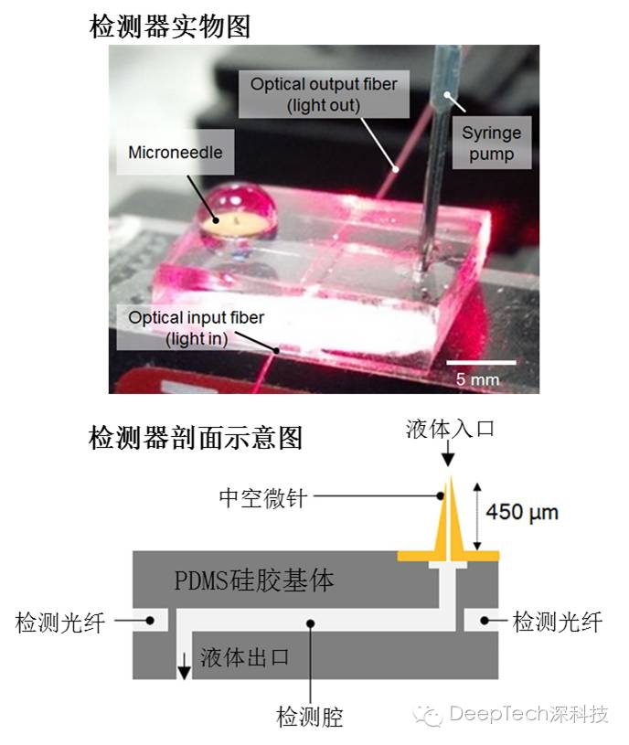 最新发明的医用微针系统,上部图片为实物照片,系统的基体材料是一种成为PDMS的常用硅胶,内部留有一条用于液体流过的空腔。下部图片为系统剖面示意图,当被用作检测器时,金属微针(内表面经过特殊处理)会穿透人体皮肤最外层的角质层,从表皮或真皮层抽取微量血液(小于1nL),当血液经过检测腔时,一束激光会通过光纤进入检测腔后再穿出,从另一头的光纤进入检测设备。通过激光的吸收率就能对血液成分进行分析了。若是要用于皮下注射,就不需要激光设备,直接将药物从上图的液体出口导入,就能通过微针注射入病人体内。图片来源:S. A. Ranamukhaarachchi, et al, Scientific Reoports 2016