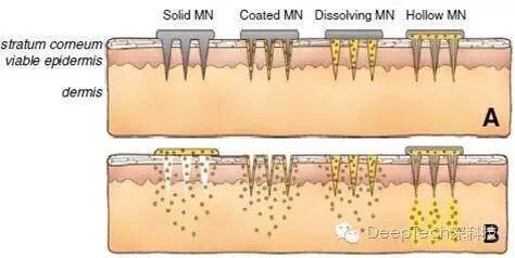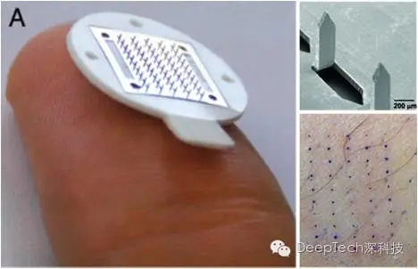 早在2000年左右,美国佐治亚理工学院的研究者们就提出,使用长度约数百微米(~400-800μm,即0.4-0.8 毫米)的针头刺破皮肤,可以在皮肤的角质层形成微米尺寸的通道,从而显著提高透皮贴膏的药物穿透能力,并能实现包括核酸、抗体、DNA和胰岛素等生物分子的给药。