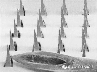 图中下方那个看起来粗壮无比的空心棱锥就是常规的针头,而其边上相对细小的结构则是微针阵列。可以说,常规针头与微型针头所具有的完全不同的使用体验,最本质的原因是由于尺寸上的巨大差异。