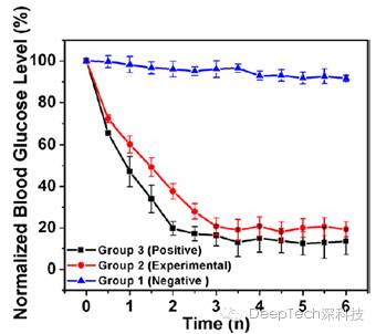本实验中使用了三组具有糖尿病症状的小白鼠。图内的横坐标为时间,纵坐标为血液中的血糖浓度。其中蓝色曲线为阴性对照组(仅在皮肤上滴了胰岛素溶液),红色曲线为实验组(使用微针后,在皮肤上滴了胰岛素溶液),黑色曲线为阳性对照组(常规针头注射)。可以发现,实验组的血糖浓度与阳性对照组相当,要显著优于阴性对照组。