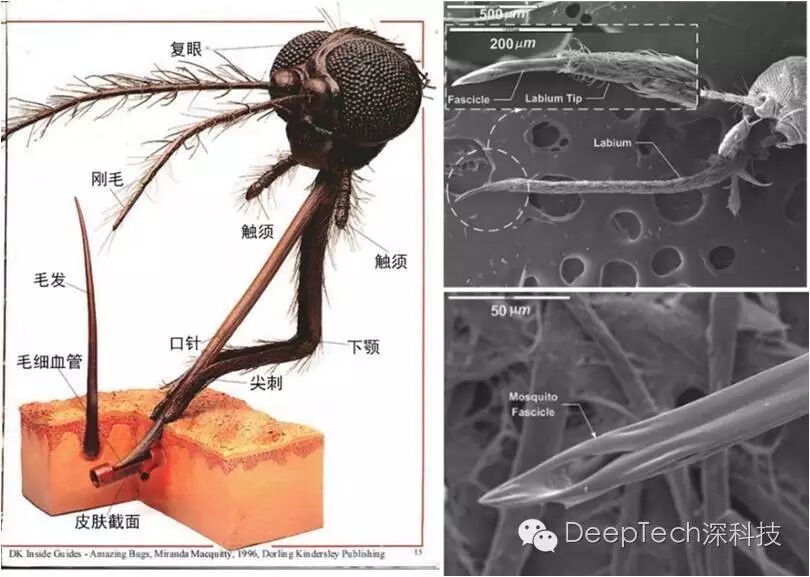 左侧:蚊子的解剖结构示意图,右图:蚊子口针的扫描电子显微镜图像,图片来源:M. Ramasubramanian, et al. Bioinspir. Biomim., 2008