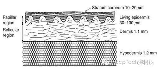 人体皮肤结构示意图,从上之下依次是角质层(Stratum corneum),上表皮(Living epidermis),真皮(Dermis)与皮下组织(Hypodermis),图片来源:N. Roxhed, et al. J. MEMS,2007