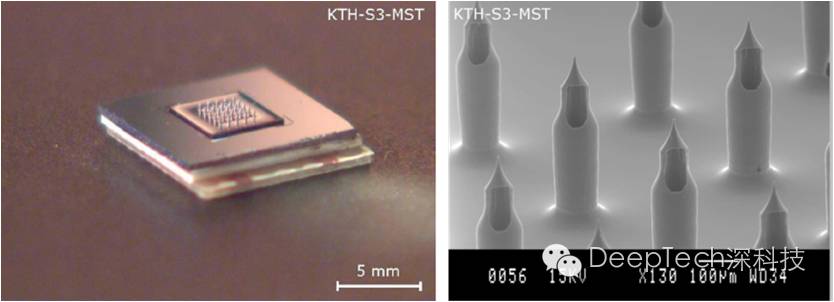 空心微针贴片(左图)和空心微针阵列的扫描电子显微镜图像。图片来源:N. Roxhed, et al. IEEE. Trans. Bio-med. Eng., 2008