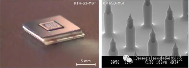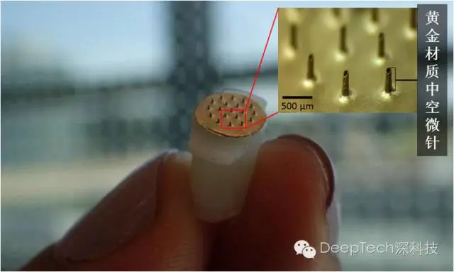 上图展示的是整套设备的核心部件之一——中空的微型针头,这些长度不到半毫米的针头能破开人体皮肤中最坚硬的角质层,低达表皮和真皮层的毛细血管,进行微量抽血或者给药,从而实现对人体的最小限度伤害。