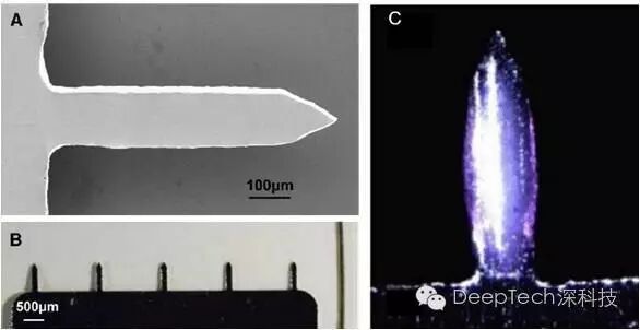 涂覆微针照片,其中(A)为微针在涂覆流感疫苗之前的扫描电子显微镜图像,(B)为宏观照片,(C)为涂覆药物之后图像。图片来源:Y.Kim, et al. J.Control. Release, 2010